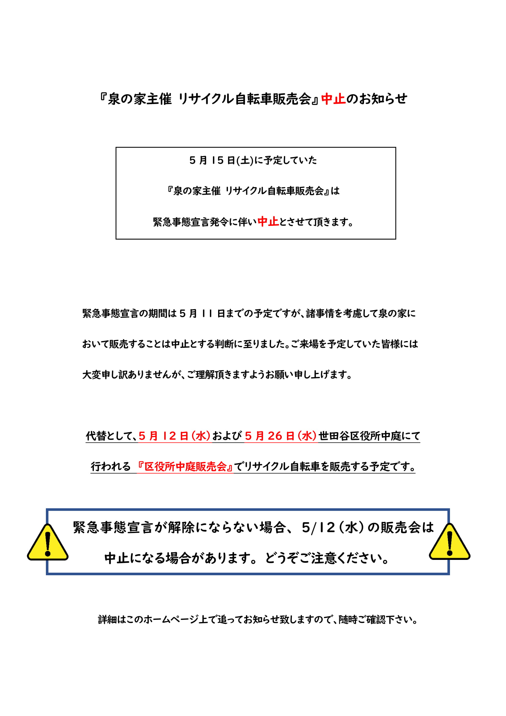 『泉の家主催 リサイクル自転車販売会』中止のお知らせ ※4月28日追記