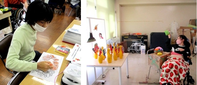 2月2日(金)。生活介護にて節分イベントを実施しました。今回は、節分らしく豆をモチーフにした手作りボールで、ボウリングのピンに貼ってある鬼を倒して退治するゲームと、節分にちなんだクイズや、節分イラストの色塗りを実施。